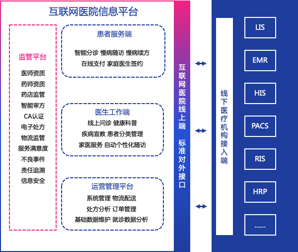 海南海悦互联网医院信息平台,包括患者服务端APP、医生工作端APP、运营平台、监管平台,共四大板块。